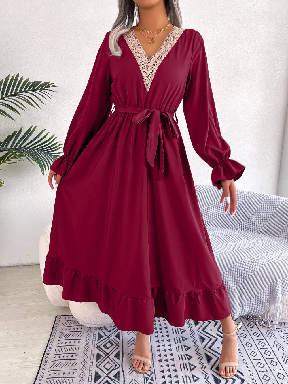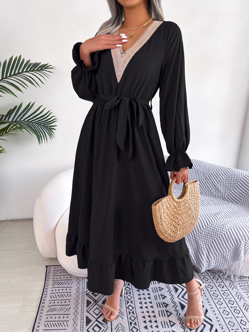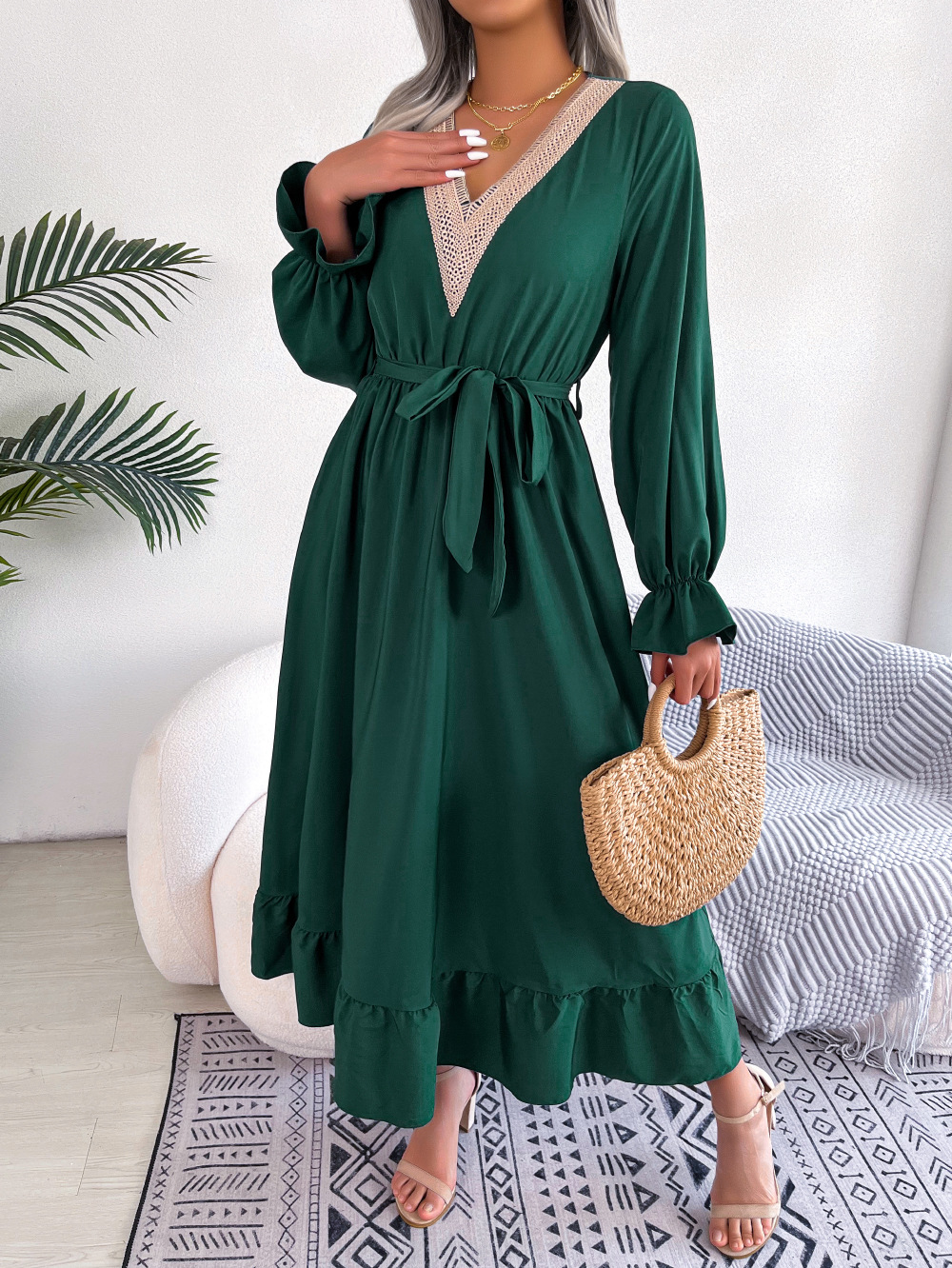Ins Style Real Shot Spring And Summer European And American Temperament V-Neck Lace Waisted Ruffled Dress