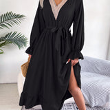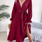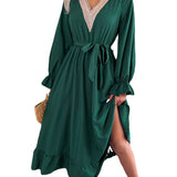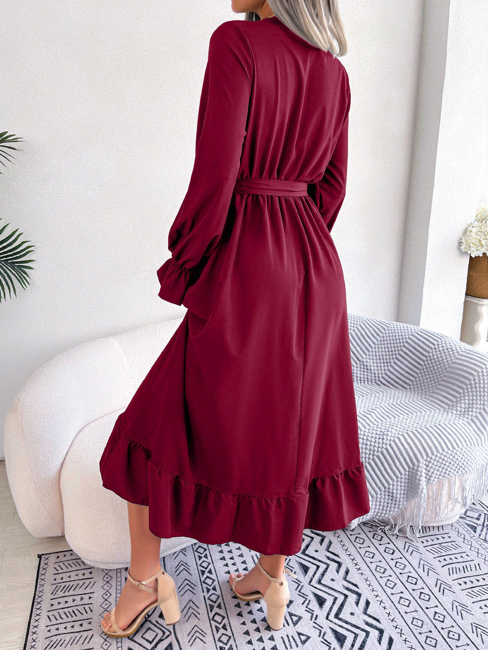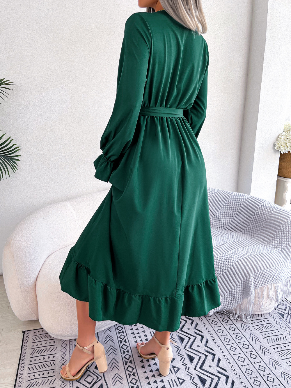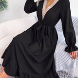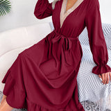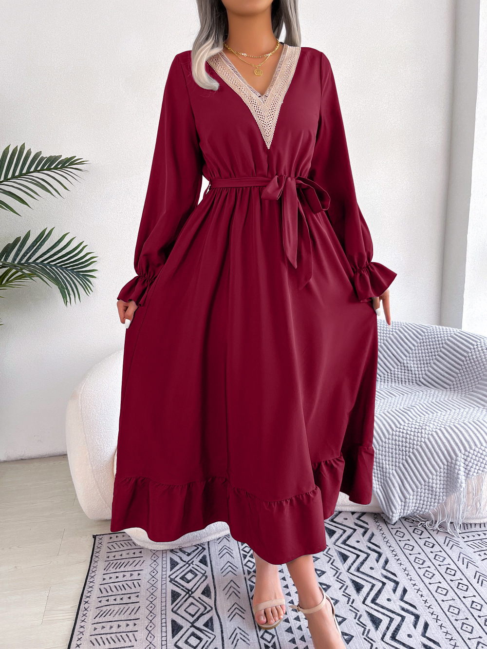 Ins Style Real Shot Spring And Summer European And American Temperament V-Neck Lace Waisted Ruffled Dress